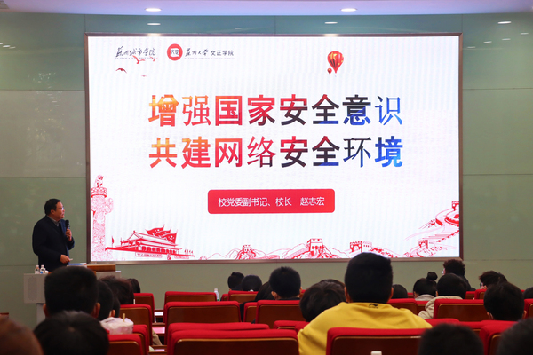 “故国虽大,好战必亡;天下虽安,忘战必危。”“一屋不扫,何以扫天下。”他表示,我们现在虽然处在和平年代,但时刻也不能忘记国家安全压在我们身上的责任。作为一名大学生,更应该从自己做起,在不断地学习中提升网络安全意识,维护国家安全。他通过一个个生动的网络安全案例,提醒大家可能面临的网络安全风险,现场就如何防范网络风险为大学生们支招,并给出网络安全攻略:一是要强化自律意识,做网络安全的守护者;二是要弘扬时代主旋律,做网络正能量的传播者;三是要提高线上学习质量,做网络发展的受益者。