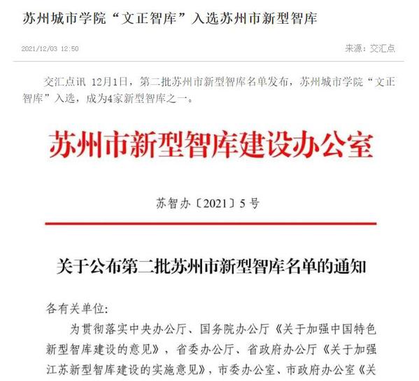 交汇点讯 12月1日,第二批苏州市新型智库名单发布,苏州城市学院“文正智库”入选,成为4家新型智库之一。