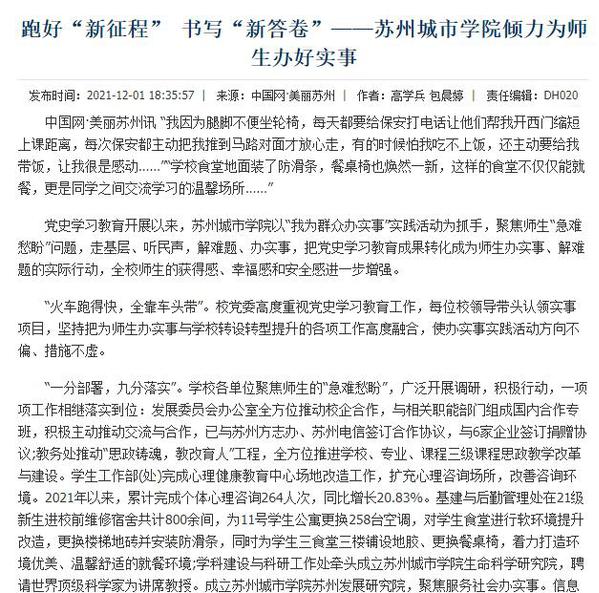 党史学习教育开展以来,苏州城市学院以“我为群众办实事”实践活动为抓手,聚焦师生“急难愁盼”问题,走基层、听民声,解难题、办实事,把党史学习教育成果转化成为师生办实事、解难题的实际行动,全校师生的获得感、幸福感和安全感进一步增强。