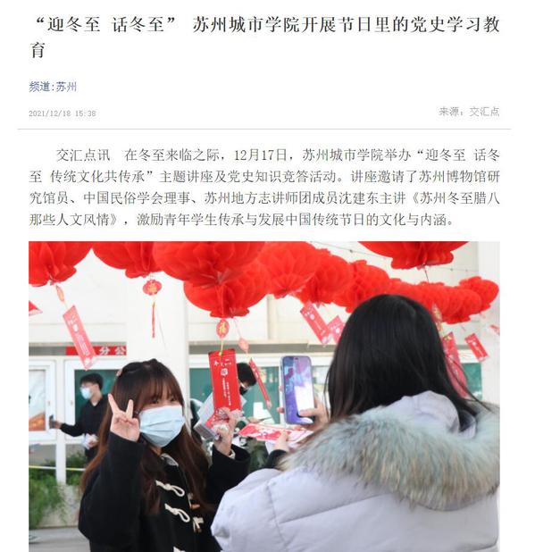 交汇点讯 在冬至来临之际,12月17日,苏州城市学院举办“迎冬至 话冬至 传统文化共传承”主题讲座及党史知识竞答活动。讲座邀请了苏州博物馆研究馆员、中国民俗学会理事、苏州地方志讲师团成员沈建东主讲《苏州冬至腊八那些人文风情》,激励青年学生传承与发展中国传统节日的文化与内涵。