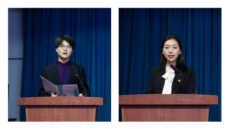 青马工程优秀学员代表20日语胡展硕、20播音陈韶君发言。两人结合“青马工程”的课程学习,分享了心得体会,两位同学均表示,在培训中,不断提高了自身的责任意识、团队意识和工作能力,作为新时代的新青年,理应传承红色基因,接过革命薪火,以青春之我,为祖国建设添砖加瓦,为民族复兴赓续奋斗。
