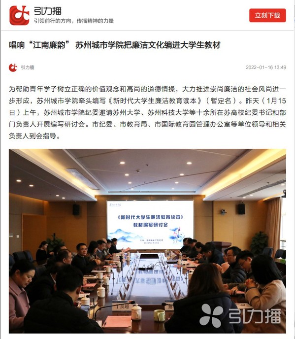 为帮助青年学子树立正确的价值观念和高尚的道德情操,大力推进崇尚廉洁的社会风尚进一步形成,苏州城市学院牵头编写《新时代大学生廉洁教育读本》(暂定名)。昨天(1月15日)上午,苏州城市学院纪委邀请苏州大学、苏州科技大学等十余所在苏高校纪委书记和部门负责人开展编写研讨会。市纪委、市教育局、市国际教育园管理办公室等单位领导和相关负责人到会指导。