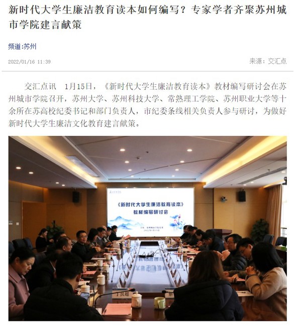 1月15日,《新时代大学生廉洁教育读本》教材编写研讨会在苏州城市学院召开,苏州大学、苏州科技大学、常熟理工学院、苏州职业大学等十余所在苏高校纪委书记和部门负责人,市纪委条线相关负责人参与研讨,为做好新时代大学生廉洁文化教育建言献策。