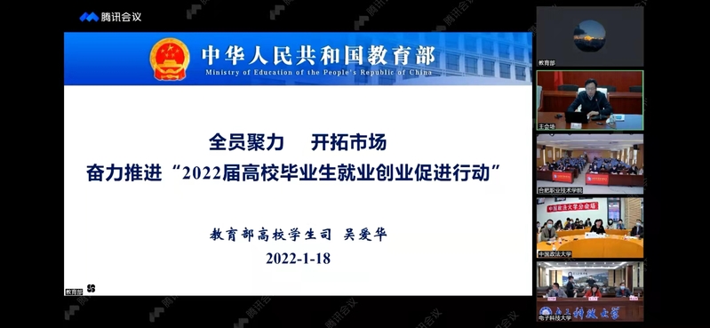 为深入贯彻党中央、国务院“稳就业”“保就业”决策部署,贯彻落实2022届全国普通高校毕业生就业工作网络视频会议精神,调度推进各地高校毕业生就业工作,1月18日,教育部召开2022届全国普通高校毕业生就业工作第一次调度视频会议。我校招生就业处、毕业班班主任代表通过腾讯会议系统组织集中观看。