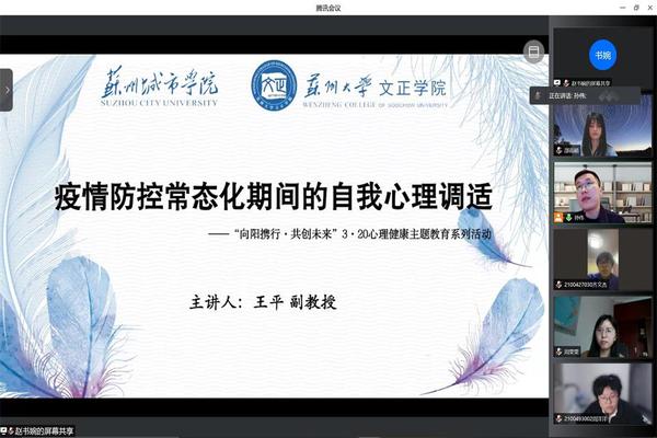 3月18日晚,我校举办“疫情防控常态化期间大学生的自我心理调适”线上专题讲座,苏州大学心理健康教育中心教师、苏州大学教育学院应用心理学硕士生导师王平副教授主讲,400余名学生参加讲座。讲座由孙伟主持。