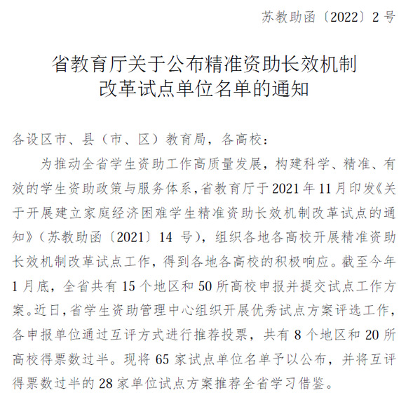 近日,江苏省教育厅发布《省教育厅关于公布精准资助长效机制改革试点单位名单的通知》(苏教助函〔2022〕2号),我校获批江苏省精准资助长效机制改革试点单位。