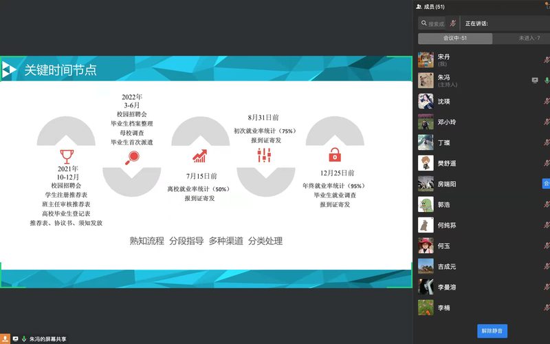 朱冯对毕业班班主任就业工作管理办法中的统计口径、考核方式、考核指标、奖励设置四个方面进行解读,明确毕业班就业流程、就业去向落实率等关键时间节点,并就派遣档案查询、就业材料补办、日常就业核查、就业指导专项行动和就业信息平台五个方面做出提醒。