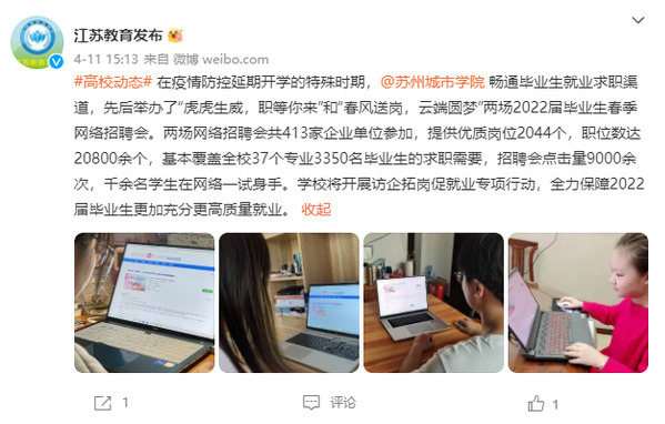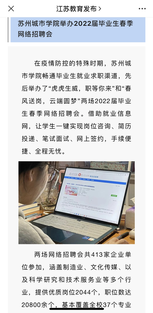 在疫情防控的特殊时期,苏州城市学院畅通毕业生就业求职渠道,先后举办了“虎虎生威,职等你来”和“春风送岗,云端圆梦”两场2022届毕业生春季网络招聘会。借助就业信息网,让学生一键实现岗位咨询、简历投递、笔试面试、网上签约,手续便捷、全程无忧。