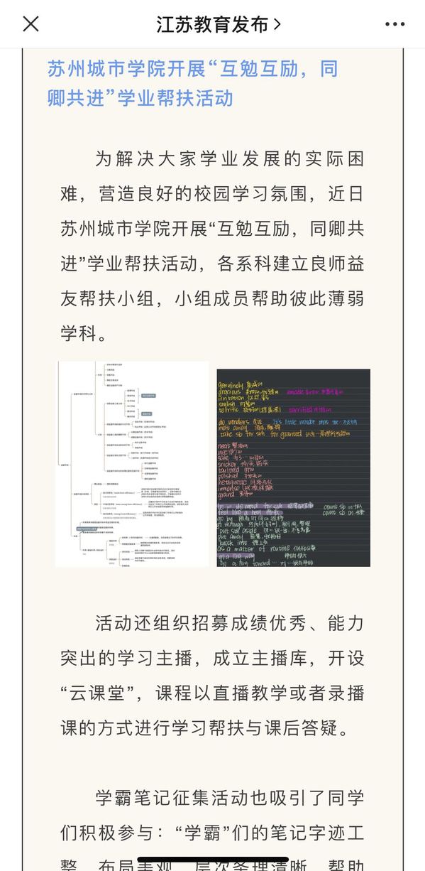 为解决大家学业发展的实际困难,营造良好的校园学习氛围,苏州城市学院开展“互勉互励,同卿共进”学业帮扶活动,各系科建立良师益友帮扶小组,小组成员帮助彼此薄弱学科。还组织招募成绩优秀、能力突出的学习主播,成立主播库,开设“SCS云课堂”,课程以直播教学或者录播课的方式进行学习帮扶与课后答疑。学霸笔记征集活动也吸引同学们积极参与,“学霸”们的笔记字迹工整,布局美观,层次条理清晰,帮助广大同学更好地迎接即将到来的期中考试,获得更好的复习效果。