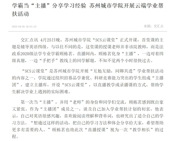 交汇点讯 4月25日晚,苏州城市学院“SCS云课堂”正式开课,首堂课的主题是辅导英语四级。与以往不同的是,这堂课的授课老师并非该院教师,而是法政系2020级法学专业学霸顾栋茗。直播间内,顾栋茗化身“主播”,一边对着四级真题,一边“手把手”教线上的同学解题,不知不觉两个小时很快过去。