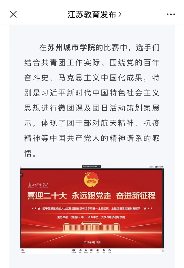 在苏州城市学院的比赛中,选手们结合共青团工作实际、围绕党的百年奋斗史、马克思主义中国化成果,特别是习近平新时代中国特色社会主义思想进行微团课及团日活动策划案展示,体现了团干部对航天精神、抗疫精神等中国共产党人的精神谱系的感悟。