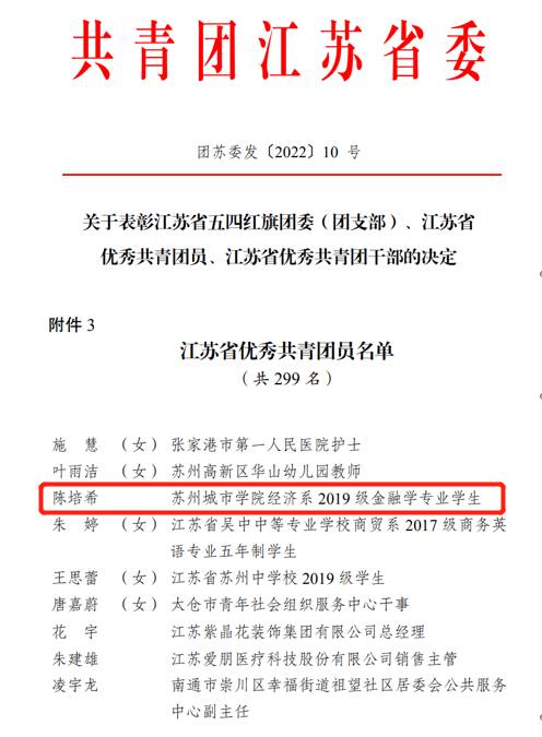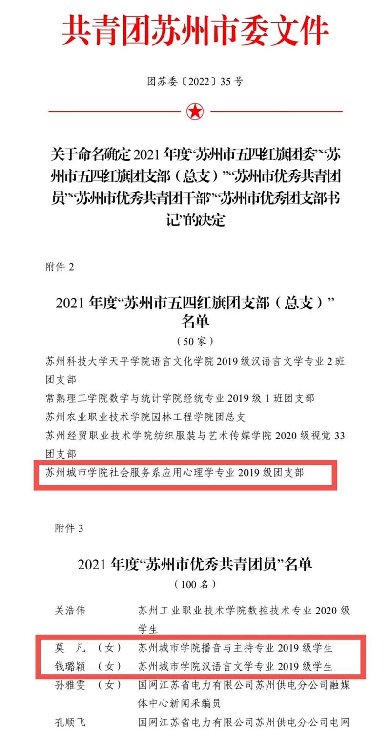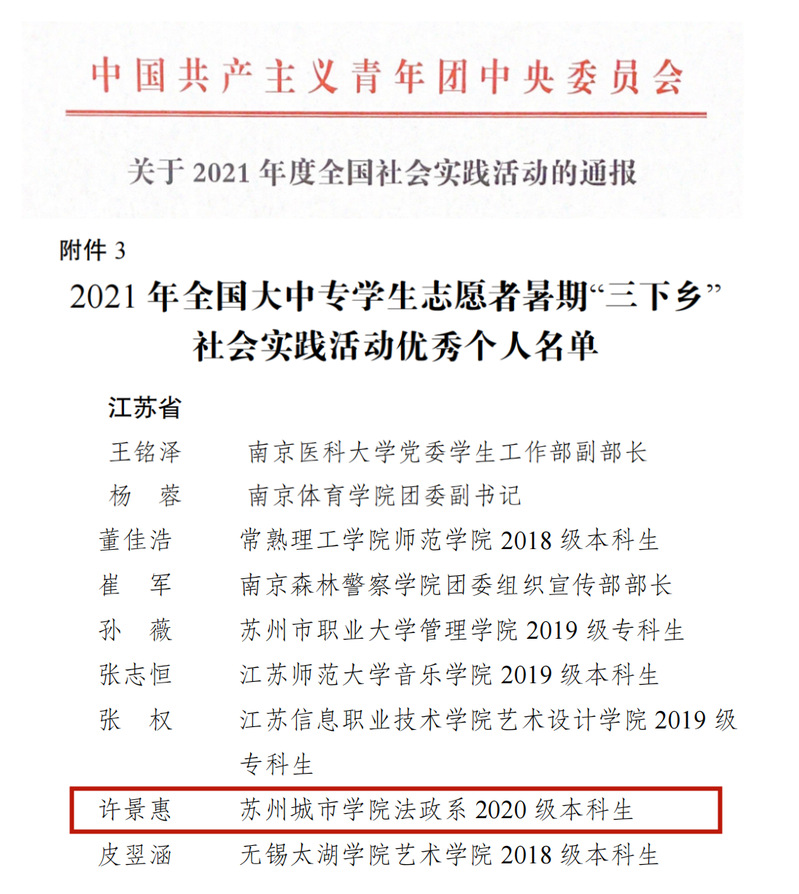 我校2020级人力资源管理专业许景惠荣获全国、江苏省“三下乡”社会实践优秀个人称号,2019级金融学专业陈培希荣获江苏省优秀共青团员、江苏省“三下乡”社会实践优秀个人称号,2018级法学专业闫纪阳带领团队“大爱微行”荣获2021年江苏省“三下乡”社会实践活动优秀团队称号,2019级档案学专业刘诗桦带领团队“与‘档’同行”荣获2021年“三下乡”“返家乡”社会实践优秀调研报告,同时荣获2021年江苏省“三下乡”社会实践活动优秀调研报告,2020级电气工程及其自动化(中外合作办学)专业1班陈智睿带领团队所在实践地——苏州市姑苏区吴门桥街道新城社区荣获2021年江苏省“三下乡”社会实践活动优秀实践基地。2019级应用心理学专业团支部荣获苏州市五四红旗团支部,2019级播音与主持专业莫凡、2019级汉语言文学专业钱璐颖荣获苏州市优秀共青团员称号。