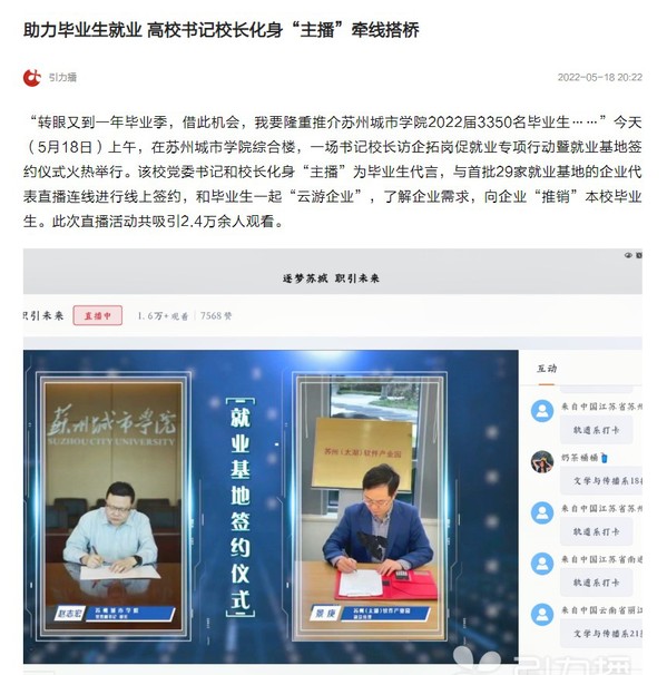 “转眼又到一年毕业季,借此机会,我要隆重推介苏州城市学院2022届3350名毕业生……”今天(5月18日)上午,在苏州城市学院综合楼,一场书记校长访企拓岗促就业专项行动暨就业基地签约仪式火热举行。该校党委书记和校长化身“主播”为毕业生代言,与首批29家就业基地的企业代表直播连线进行线上签约,和毕业生一起“云游企业”,了解企业需求,向企业“推销”本校毕业生。此次直播活动共吸引2.4万余人观看。