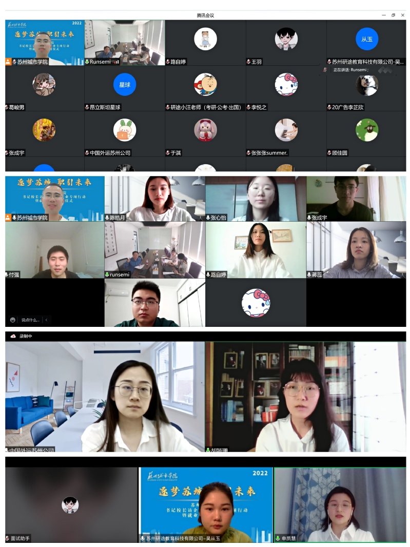 若名芯半导体科技(苏州)有限公司、中国外运长江有限公司苏州分公司、苏州研途教育科技有限公司、苏州斯泰姆科技培训有限公司四家单位参与下午的“面试直通车”活动,近30位学生投递简历,通过腾讯会议参与云上面试,积极向企业展示良好风采,十余人通过一面进入二面环节或达成初步就业意向。