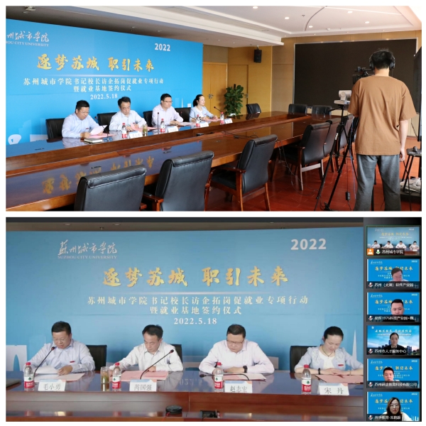 为贯彻落实党中央、国务院关于高校毕业生就业工作的决策部署和教育部、省教育厅关于高校书记校长访企拓岗促就业专项行动的通知精神,千方百计开拓更多就业创业岗位和机会,深入落实就业工作“一把手”工程,5月18日,我校通过现场直播+线上会议的方式举行了书记校长访企拓岗促就业专项行动暨就业基地签约仪式,校党委书记芮国强,校党委副书记、校长赵志宏,苏州市人才服务中心人事代理科科长陈剑虹,苏州(太湖)软件产业园副总经理景庚等29家用人单位代表,校访企拓岗促就业专项行动领导小组成员,2022届、2023届学生代表参加活动。仪式由校党委常委、副校长毛小勇主持。