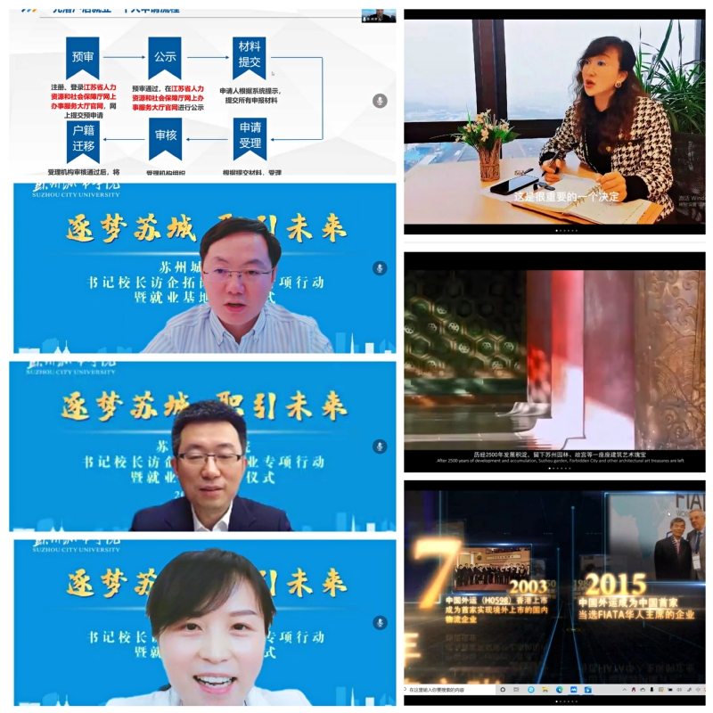 苏州市人才服务中心介绍了毕业生留苏政策,苏州(太湖)软件产业园、中国建设银行股份有限公司苏州分行、苏州易德龙科技股份有限公司三家用人单位介绍企业发展现状,并表示将充分发挥好苏州城市学院就业实践基地的作用,进一步深化双方人才培养合作模式。莱克电气股份有限公司、金螳螂家数字科技(苏州)有限公司、中国外运长江有限公司苏州分公司三家单位进行企业“云游”,生动立体地向学生展示工作环境、企业文化、培养机制等。