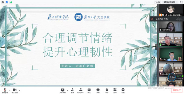 5月23日晚,我校举办“合理调节情绪·提升心理韧性”线上专题讲座。此次讲座邀请苏州大学应用技术学院文化旅游学院副院长、高等教育心理学博士、副研究员史新广主讲,由党委学生工作部(处)孙伟主持。