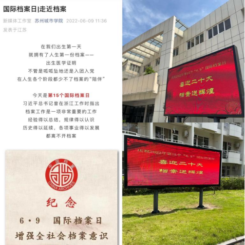 为大力宣传国际档案日,我们采取线上线下相结合的模式开展宣传工作。6月8日起,学校电子屏滚动发布“国际档案日”专题海报。6月9日,利用学校官方微信公众号,以“国际档案日|走近档案”为题,发表微信推文。依托新媒体平台宣传档案知识,展现学校档案学科建设成果。