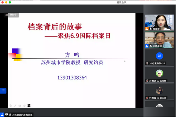 6月9日晚,举办国际档案日专题讲座。本次讲座邀请到苏州城市学院档案学专业教师、研究馆员方鸣担任主讲,以“档案背后的故事”为主题,鼓舞当代学生用档案讲好红色故事、用科技创造未来,来实际行动档案事业的蓬勃发展。