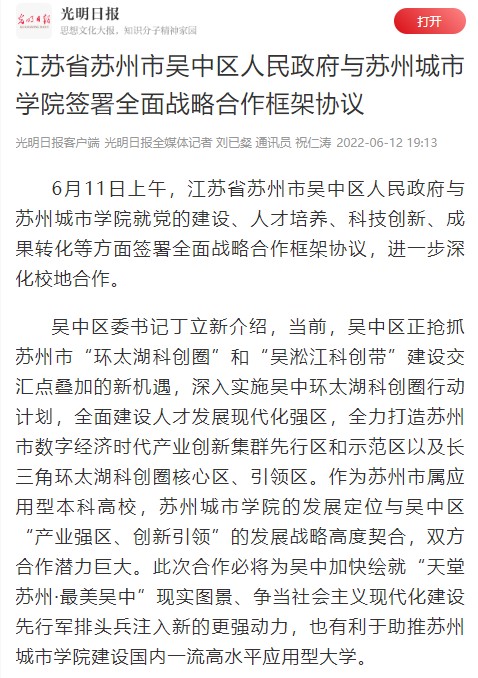 6月11日上午,江苏省苏州市吴中区人民政府与苏州城市学院就党的建设、人才培养、科技创新、成果转化等方面签署全面战略合作框架协议,进一步深化校地合作。