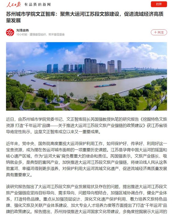 近日,由苏州城市学院党委书记、文正智库院长芮国强教授执笔的研究报告《挖掘特色文旅资源 打造“千年运河”品牌——关于推进大运河江苏段文旅产业强链的政策建议》获江苏省领导肯定性批示,这是文正智库成立以来又一重要成果。