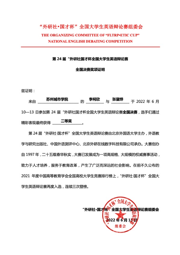 613日,第24届“外研社·国才杯”全国大学生英语辩论赛落下帷幕,由我校外语系教师杨田田担任指导,20英语(W)张鋆烨和21英语(W)李柯欣所组成的辩论队代表学校参赛,最终获得全国二等奖的佳绩。