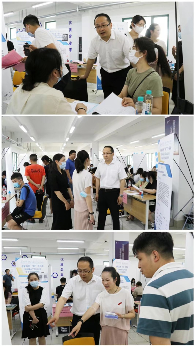 刘强一行在招生就业处负责人宋丹的带领下查看了招聘会现场,并就企业简历收集情况和学生应聘反馈等向来访嘉宾进行介绍,相城区政协副主席、区人社局局长金燕表示,看到现场企业积极推介、学生踊跃尝试,感到双方搭建就业平台、畅通就业渠道既重要也必要。