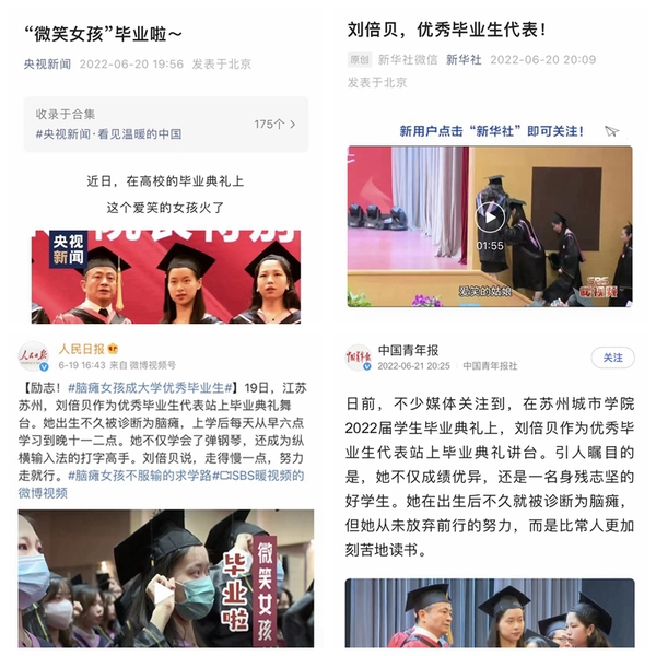今年的二〇二二届学生毕业典礼暨学士学位授予仪式上,我校毕业生刘倍贝受到媒体关注,并一度冲上热搜。7月4日,CCTV-13新闻频道《24小时遇见你》栏目播出了八分多钟的新闻《“微笑女孩”刘倍贝:慢慢走 不放弃 脑瘫女孩成“大学优秀毕业生”》《微笑女孩”刘倍贝:慢慢走 不放弃 心里有光 温暖自己 照亮他人》《“微笑女孩”刘倍贝:慢慢走 不放弃 微笑面对生活 努力书写未来》,深入报道我校2022届优秀毕业生刘倍贝。