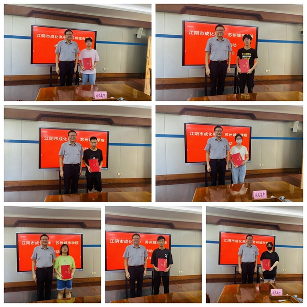 赵志宏也为江阴市成化高级中学送上感谢信,并为学生颁发录取通知书和纪念品,随后,还就教育教学、学生培养等方面与江阴市成化高级中学的老师们进行座谈交流。