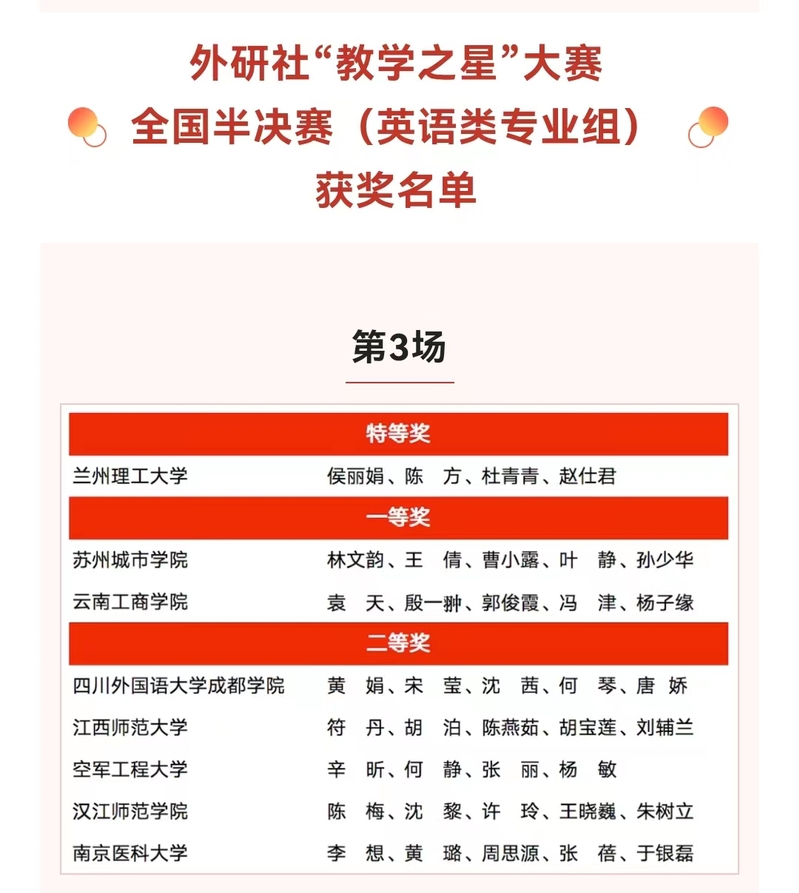 外研社“教学之星”大赛创办于2013年,是面向全国高等学校外语教师的大型赛事,在全国高校外语教育领域广受认可,被列入中国高等教育学会《高校竞赛评估与管理体系研究》数据来源。本届“教学之星”大赛主题为“外语教材的有效使用:思想性与科学性相统一”。半决赛包含7分钟教学设计介绍、10分钟课堂教学展示、3分钟现场问答三个环节,综合考查了参赛团队的教学设计、课堂教学及临场应变等综合能力。