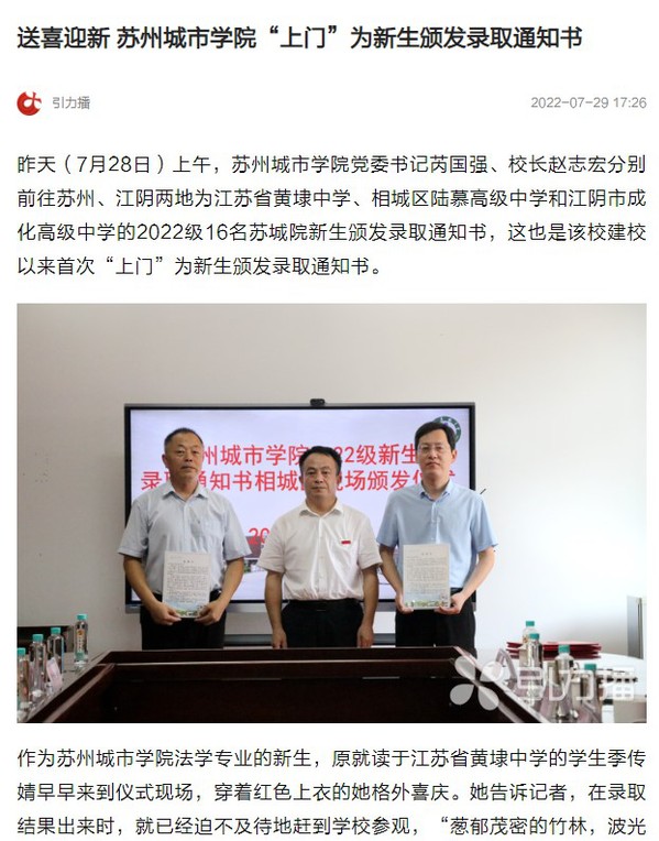 “校领导‘上门’为新生颁发录取通知书,这一举措让我们体会到苏州城市学院对新生录取工作的重视,更感受到学校对人才培养的用心与真诚。”相城区委教育工委书记、区教育局局长耿昌洪说。