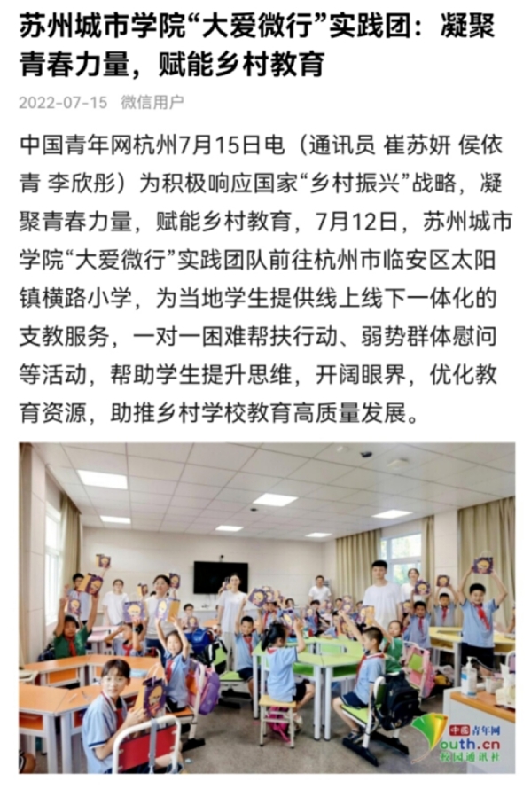 为积极响应国家“乡村振兴”战略,凝聚青春力量,赋能乡村教育,7月12日,苏州城市学院“大爱微行”实践团队前往杭州市临安区太阳镇横路小学,为当地学生提供线上线下一体化的支教服务,一对一困难帮扶行动、弱势群体慰问等活动,帮助学生提升思维,开阔眼界,优化教育资源,助推乡村学校教育高质量发展。
