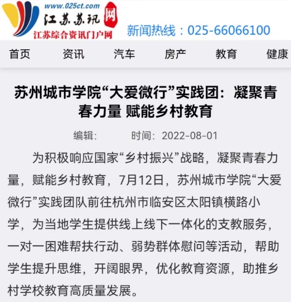 为积极响应国家“乡村振兴”战略,凝聚青春力量,赋能乡村教育,7月12日,苏州城市学院“大爱微行”实践团队前往杭州市临安区太阳镇横路小学,为当地学生提供线上线下一体化的支教服务,一对一困难帮扶行动、弱势群体慰问等活动,帮助学生提升思维,开阔眼界,优化教育资源,助推乡村学校教育高质量发展。