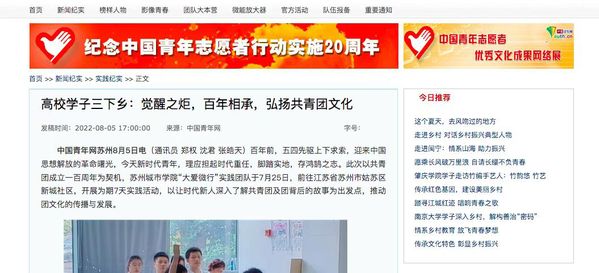 百年前,五四先驱上下求索,迎来中国思想解放的革命曙光,今天新时代青年,理应担起时代重任,脚踏实地,存鸿鹄之志。此次以共青团成立一百周年为契机,苏州城市学院“大爱微行”实践团队于7月25日,前往江苏省苏州市姑苏区新城社区,开展为期7天实践活动,以让时代新人深入了解共青团及团背后的故事为出发点,推动团文化的传播与发展。