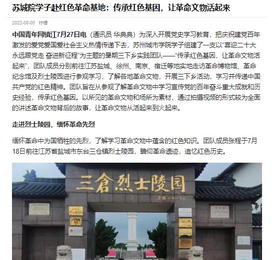 为深入开展党史学习教育,把庆祝建党百年激发的爱党爱国爱社会主义热情传递下去,苏州城市学院学子组建了一支以“喜迎二十大,永远跟党走,奋进新征程”为主题的暑期三下乡实践团队——“传承红色基因,让革命文物活起来”,团队成员分别前往江苏盐城、徐州、南京、宿迁等地实地走访革命博物馆、革命纪念馆及烈士陵园进行参观学习,了解各地革命文物,开展三下乡活动,学习并传递中国共产党的红色精神。团队旨在从参观了解革命文物中学习宣传党的百年奋斗重大成就和历史经验,传承红色基因。以所见的革命文物和场所为素材,通过拍摄视频的形式较为全面的讲述革命文物背后的故事,让革命文物从活起来到火起来。