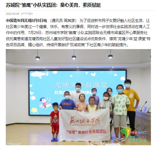 为了促进新市民子女更好融入社区生活,让社区青少年度过一个健康、快乐、有意义的暑假,同时进一步发挥社会实践活动在育人工作中的作用,7月29日,苏州城市学院“雏鹰”小队实践团联合无锡市梁溪区开心果服务社依托黄巷街道龙塘西苑社区儿童友好型社区建设试点优势条件,擦亮“龙塘少年‘益’课堂”特色项目品牌,精心组织、持续开展做好“双减政策”下社区青少年的赋能提升。