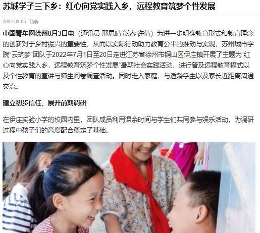 为进一步明确教育形式和教育理念的创新对于乡村振兴的重要性,从而以实际行动助力教育公平的推动与实现,苏州城市学院“云筑梦”团队于2022年7月1日至20日走进江苏省徐州市铜山区伊庄镇开展了主题为“红心向党实践入乡,远程教育筑梦个性发展”暑期社会实践活动,进行普及远程教育模式以及个性教育的宣讲与师生问卷调查活动。同时走入家庭,与适龄学生以及家长近距离沟通交流。