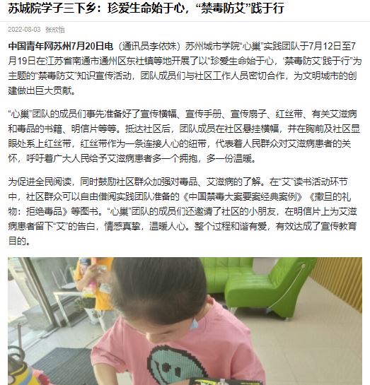 苏州城市学院“心巢”实践团队于7月12日至7月19日在江苏省南通市通州区东社镇等地开展了以“珍爱生命始于心,‘禁毒防艾’践于行”为主题的“禁毒防艾”知识宣传活动,团队成员们与社区工作人员密切合作,为文明城市的创建做出巨大贡献。
