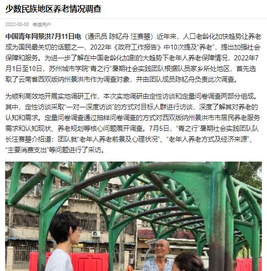 近年来,人口老龄化加快趋势让养老成为国民最关切的话题之一,2022年《政府工作报告》中10次提及“养老”,提出加强社会保障和服务。为进一步了解在中国老龄化加剧的大趋势下老年人养老保障情况,2022年7月1日至10日,苏州城市学院“青之行”暑期社会实践团队根据队员家乡所处地区,首先选取了云南省西双版纳州景洪市作为调查对象,并由团队成员陈钇舟负责此次调查。