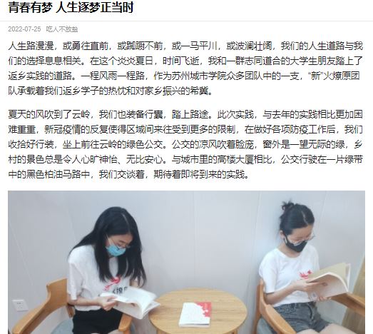 人生路漫漫,或勇往直前,或踟蹰不前,或一马平川,或波澜壮阔,我们的人生道路与我们的选择息息相关。在这个炎炎夏日,时间飞逝,我和一群志同道合的大学生朋友踏上了返乡实践的道路。一程风雨一程路,作为苏州城市学院众多团队中的一支,“新”火燎原团队承载着我们返乡学子的热忱和对家乡振兴的希冀。