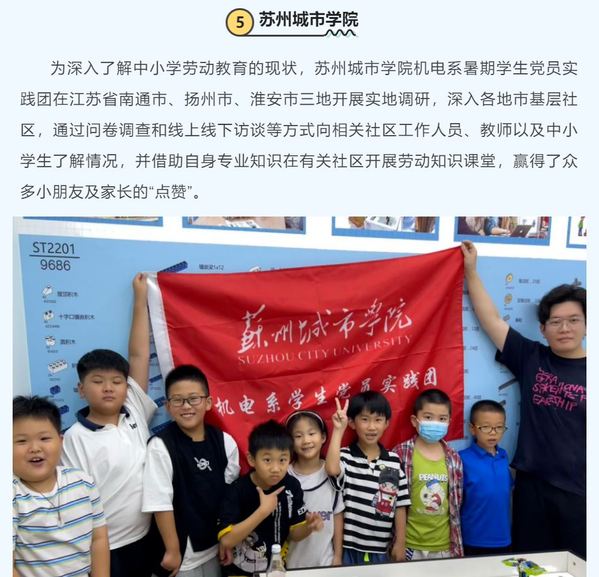 为深入了解中小学劳动教育的现状,苏州城市学院机电系暑期学生党员实践团在江苏省南通市、扬州市、淮安市三地开展实地调研,深入各地市基层社区,通过问卷调查和线上线下访谈等方式向相关社区工作人员、教师以及中小学生了解情况,并借助自身专业知识在有关社区开展劳动知识课堂,赢得了众多小朋友及家长的“点赞”。