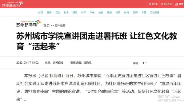 近日,苏州城市学院“百年团史宣讲团走进社区宣讲红色故事”暑期社会实践团队走进苏州市白洋湾街道和美社区,为社区暑托班的学生们带来了“重温百年团史,勇担青春使命”主题的理论宣讲、“DIY红色故事绘本”等活动,促使红色文化教育“活起来”。