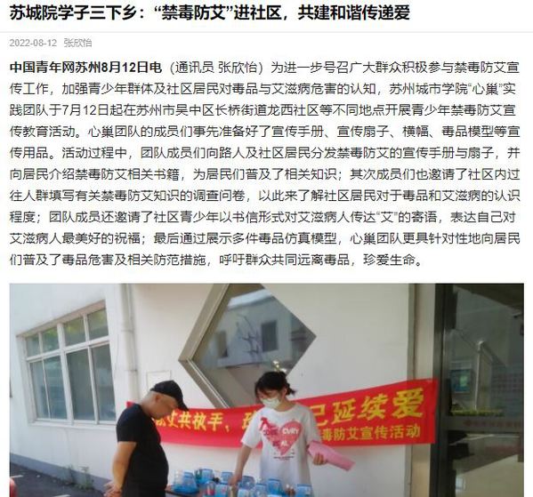 为进一步号召广大群众积极参与禁毒防艾宣传工作,加强青少年群体及社区居民对毒品与艾滋病危害的认知,苏州城市学院“心巢”实践团队于7月12日起在苏州市吴中区长桥街道龙西社区等不同地点开展青少年禁毒防艾宣传教育活动。心巢团队的成员们事先准备好了宣传手册、宣传扇子、横幅、毒品模型等宣传用品。活动过程中,团队成员们向路人及社区居民分发禁毒防艾的宣传手册与扇子,并向居民介绍禁毒防艾相关书籍,为居民们普及了相关知识;其次成员们也邀请了社区内过往人群填写有关禁毒防艾知识的调查问卷,以此来了解社区居民对于毒品和艾滋病的认识程度;团队成员还邀请了社区青少年以书信形式对艾滋病人传达“艾”的寄语,表达自己对艾滋病人最美好的祝福;最后通过展示多件毒品仿真模型,心巢团队更具针对性地向居民们普及了毒品危害及相关防范措施,呼吁群众共同远离毒品,珍爱生命。
