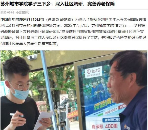 为深入了解所在地区老年人养老保障相关情况以及针对存在的问题提出解决方案,2022年7月7日,苏州城市学院“青之行——乡村振兴战略背景下农村养老问题调研团队”成员前往河南省郑州市管城回族区富田社区进行实地调研,对社区基层工作人员以及社区老年居民进行了采访,并积极结合所学知识为更好保障社区老年人养老生活建言献策。