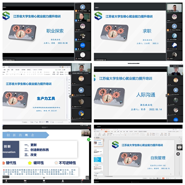 举办江苏省2022年大学生核心就业能力培训班,培训班以线上方式开展,共104名家庭经济困难、就业能力困难或有培训需求的2023届、2024届毕业生参加,六位主讲老师通过腾讯会议平台进行六个模块的线上授课,采用视频引入、案例分析、职场情景模拟等形式展开培训。
