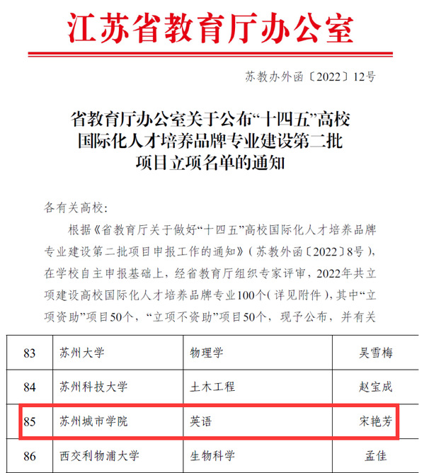2022年5月,我校英语专业成功获批江苏省教育厅 “十四五” 高校国际化人才培养品牌专业建设项目立项。英语专业自2018年以来依托 “中美人才培养计划” ,举办中美学分互认联合培养项目,该项目2022届毕业生近50%被哥伦比亚大学、纽约大学、伦敦大学学院、爱丁堡大学等世界顶尖名校录取为硕士研究生,培养成果凸显。未来五年,我校将以此为激励,努力培育与打造我校重点学科与专业国际化品牌,助推我校国际化人才培养质量稳步提升。