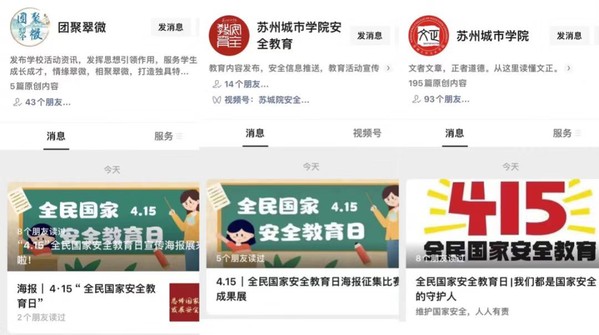 狠抓安全教育,筑牢师生安全意识防线。发挥媒体和渠道作用,采取多种方式,大力开展防渗透、防暴恐、防邪教、防火、防盗、防诈骗和扫黑除恶斗争的安全宣传教育,营造了浓厚的安全宣传教育氛围。一是充分发挥“两微一端”作用,运用新媒体开展安全宣传,开通官方微信公众号、视频号“苏州城市学院安全教育”常态化开展各类线上安全教育,普及安全知识;通过举办“安全教育月”为主题的系列活动、 “415全民国家安全教育日知识竞赛、海报征集比赛”、“安全生产月”宣传、推广安装注册“国家反诈中心APP”等形式,提高师生安全防范意识和自我保护能力。二是采取“请进来”的方式邀请苏州大学、吴中消防救援大队、区公安局“意识防”专班做专题讲座,相继组织开展了防范电信诈骗、防暴恐、国家安全、消防应急疏散演练等多种宣传教育活动,达60余场次,参与师生7000余人,印制3500册《安全教育第一课宣传手册》随录取通知书邮寄新生,切实提高了师生安全意识和自防自救能力。