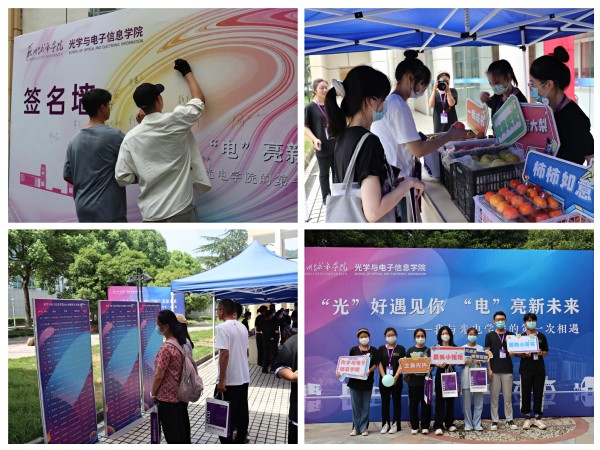 “光”好遇见你,“电”亮新未来——我与光电学院的第一次相遇系列迎新活动吸引了众多新生踊跃参与。活动内容包含:第一次印记——新生签名合影,让新生们留下在光学与电子信息学院的第一笔签名;第一次相识——展示了学院近3年研究生录取情况和近2年科研竞赛情况,让新生感受到学院人才培养的特色;第一次惊喜——为新生们精心准备了抽盲盒大礼包,让新生收到了入校后不一样的惊喜;第一次收获——一“橘”成名、大吉大“梨”、“柿柿”如意、“苹苹”安安,萌新们不仅收获了甜美的水果,也收获了学院送给他们美好的祝福。此外,学院还为每位新生准备了精心设计的手提袋,让他们收获感满满。