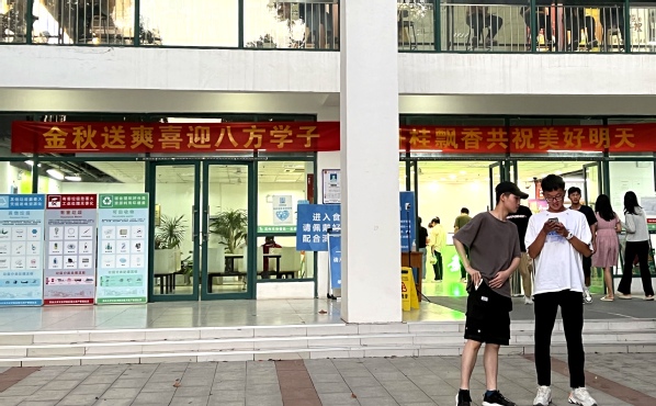 校园里,迎新气氛热烈温馨。新校门入校通道沿路搭建了展示板、张贴了学校标志和标语,南大门“前行”雕塑前面布置了标语和花卉景观,表达了对新生们的期待与欢迎。