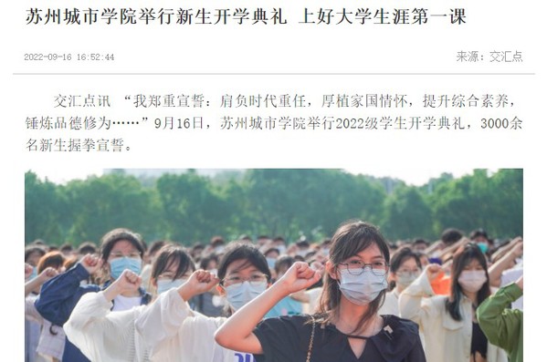 “我郑重宣誓:肩负时代重任,厚植家国情怀,提升综合素养,锤炼品德修为……”9月16日,苏州城市学院举行2022级学生开学典礼,3000余名新生握拳宣誓。